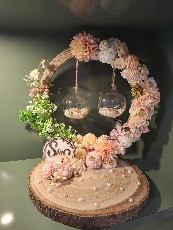 10″ natural wooden slice ( bride and groom name, date, # etc) , 12″ front ring with flower decoration, 2 glass jar as a ring holder